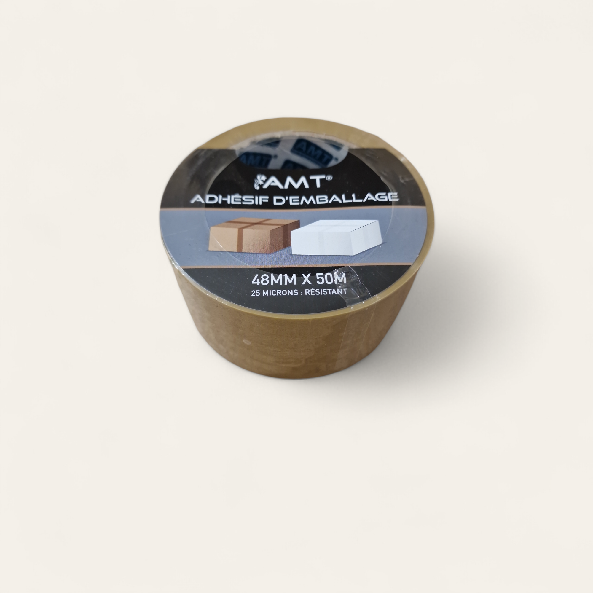 Rouleau adhésif d’emballage AMT de 48mm de largeur et 50 mètres de longueur en polypropylène de couleur havane.
