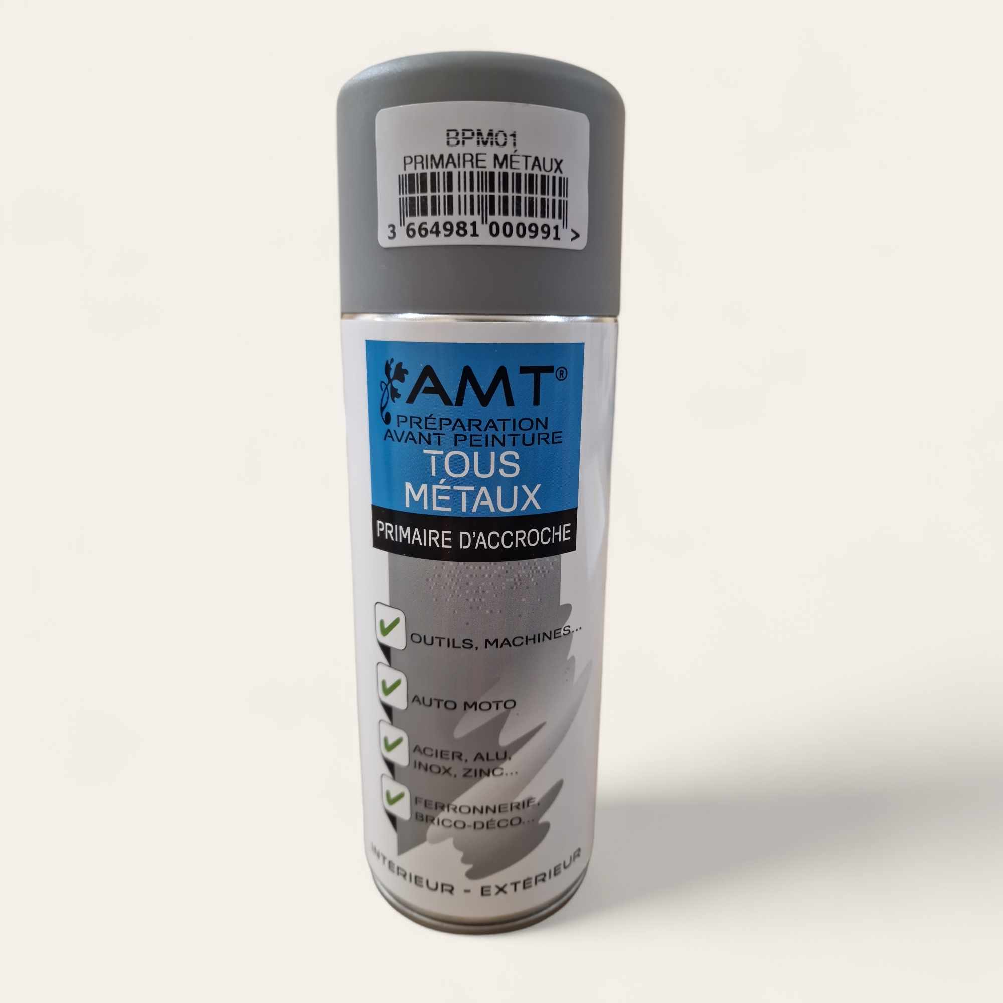 AMT Aérosol Primaire d’accroche Tous métaux est un apprêt d’accrochage de couleur grise, à base de résine alkyde, étudiée pour préparer durablement avant rénovation la plupart des surfaces métalliques: cuivre, aluminium, laiton, feuille de métal galvanisé, zinc…